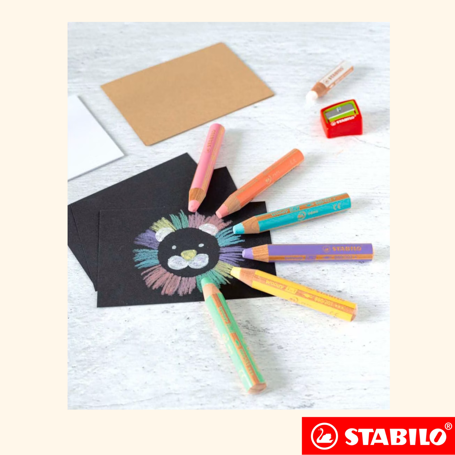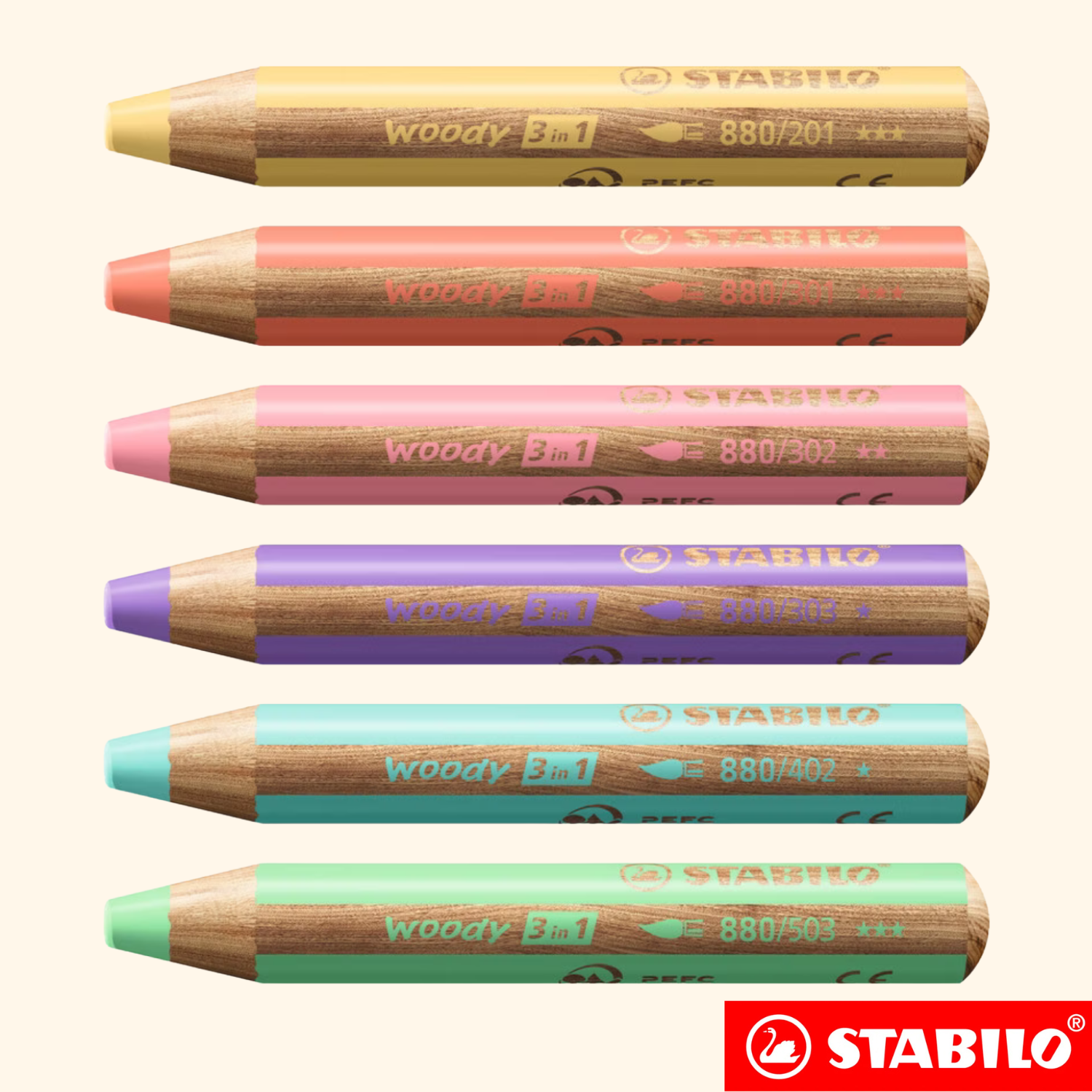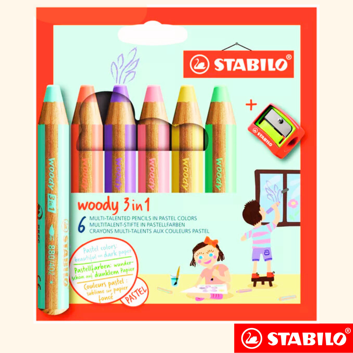 Crayon original Stabilo WOODY 3 en 1 PASTEL - 6 pièces + taille crayon